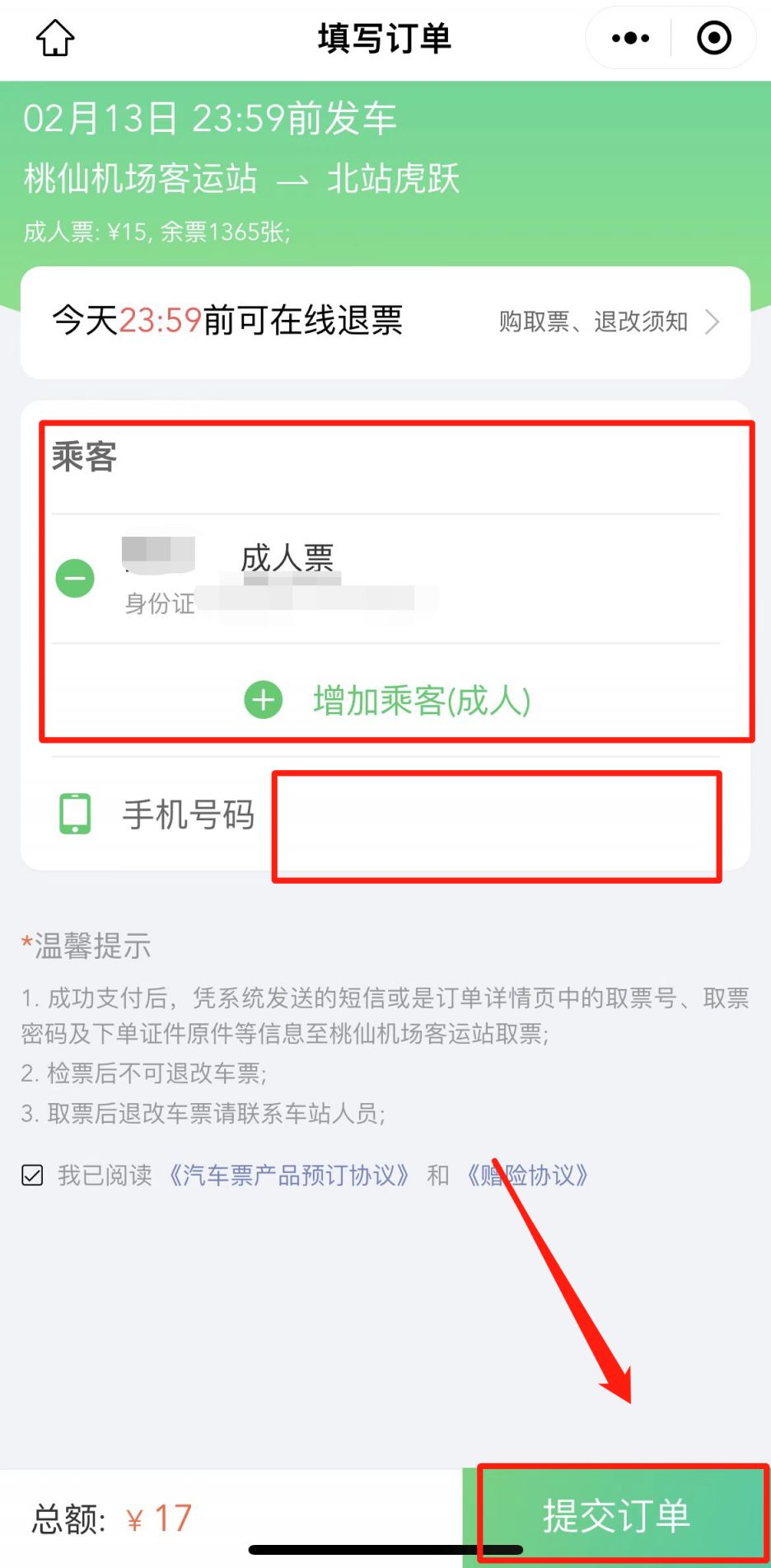 4、按照提示添加乘車人信息,收入手機號碼,點擊底部“提交訂單”后支付即可。